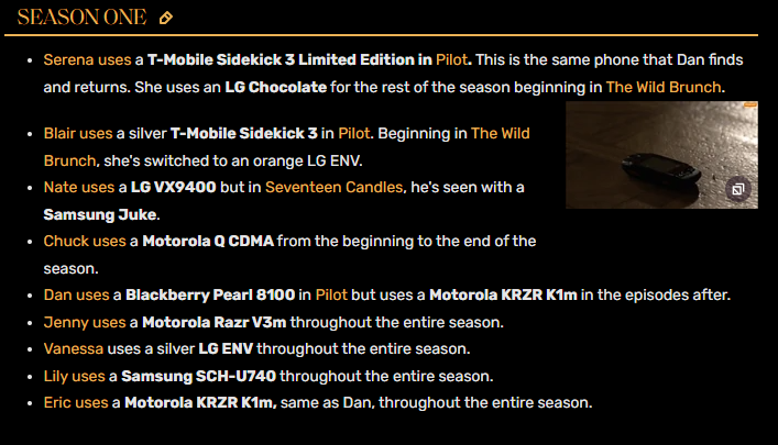 ドラマのメインキャストがどの種類の携帯電話を持っていたかという一覧があった。